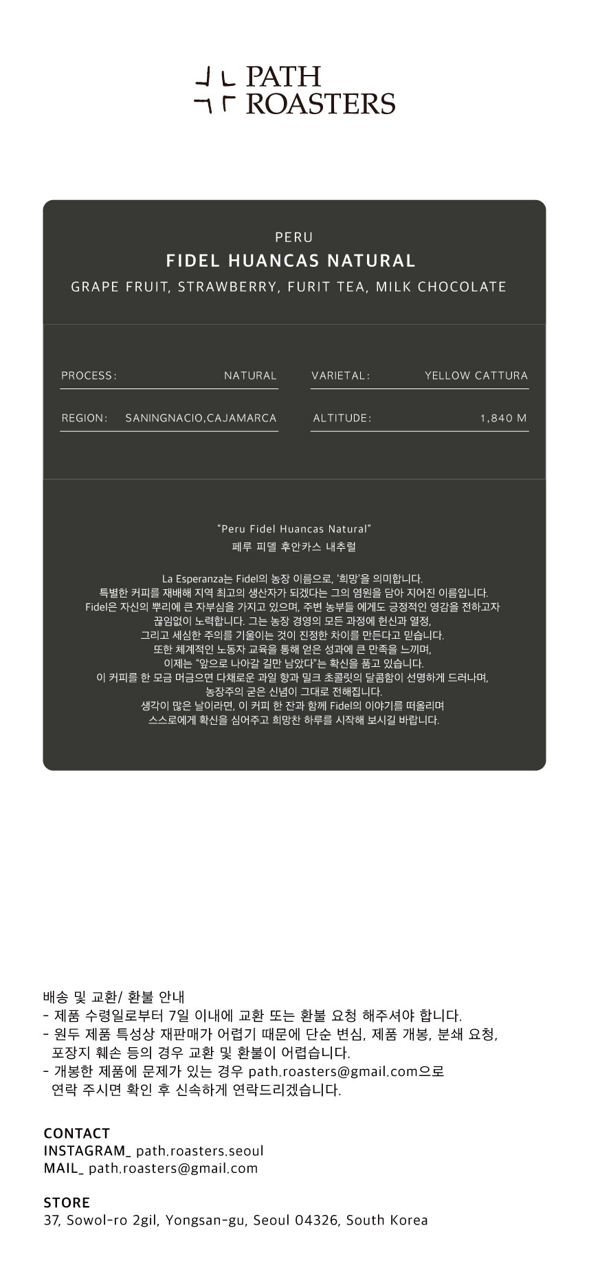 패스로스터스(PATH ROASTERS) | 사업자등록번호 531-32-01353 | 대표자 원선본 | 서울 용산구 소월로2길 37 | path.roasters@gmail.com